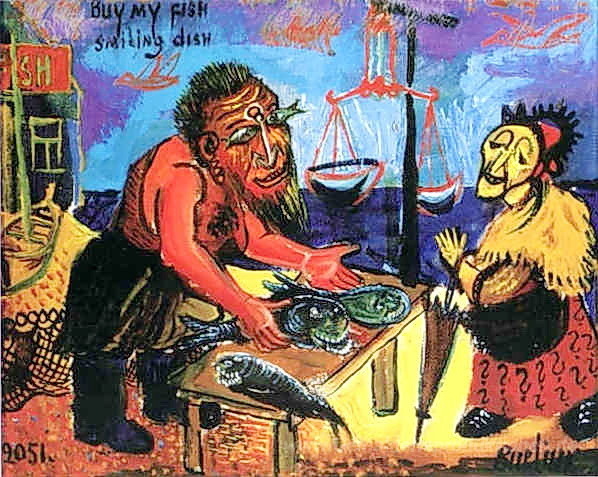 Wir bieten Ihnen eine handgefertigte Reproduktion auf Leinwand des berühmten Kunstwerks 'Kaufen Sie meine Fische!' von David Burliuk, aus dem Reproduktionsmuseum.
