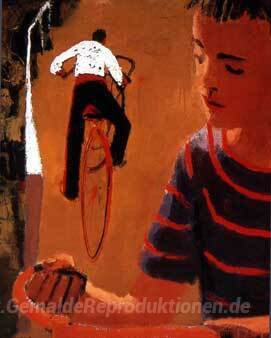 Wir bieten Ihnen eine handgefertigte Reproduktion auf Leinwand des berühmten Kunstwerks 'Kids on Bikes' von David Park, aus dem Reproduktionsmuseum.