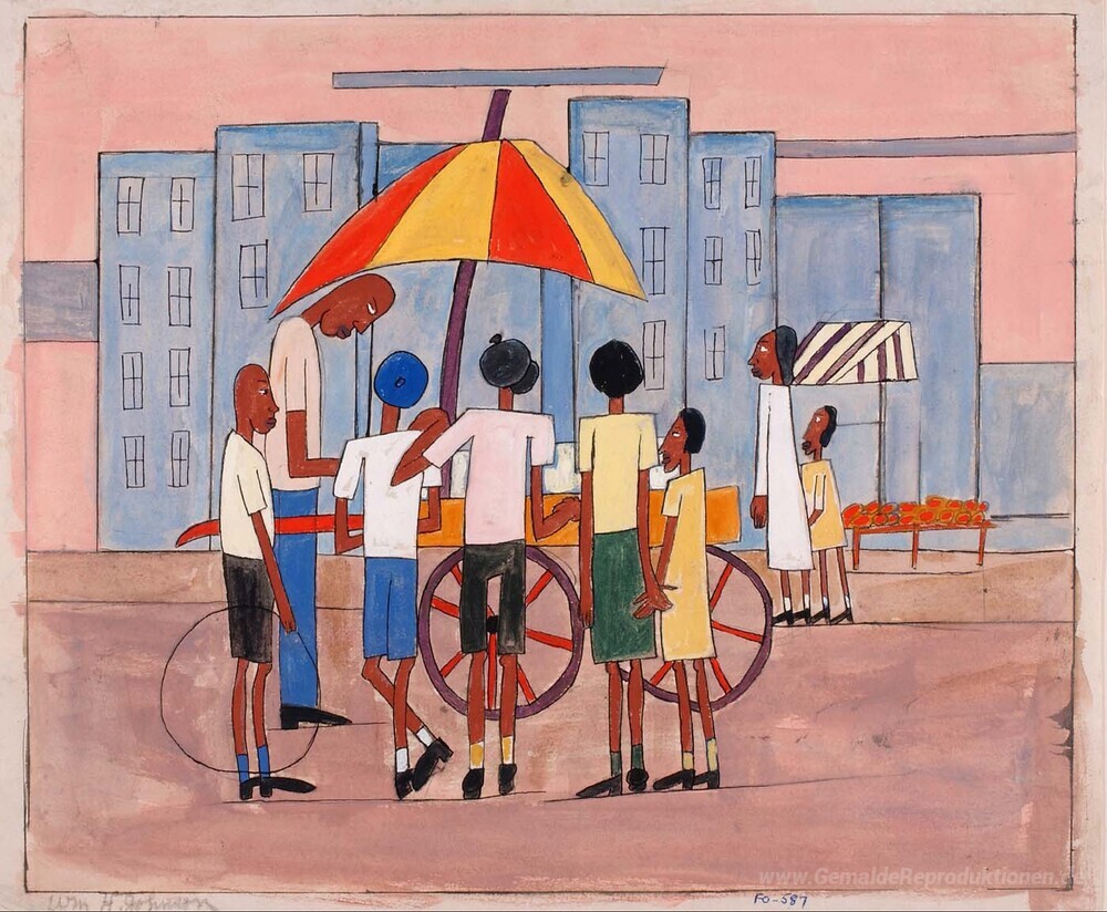 Wir bieten Ihnen eine handgefertigte Reproduktion auf Leinwand des berühmten Kunstwerks 'Kinder am Eisstand' von William H. Johnson, aus dem Reproduktionsmuseum.