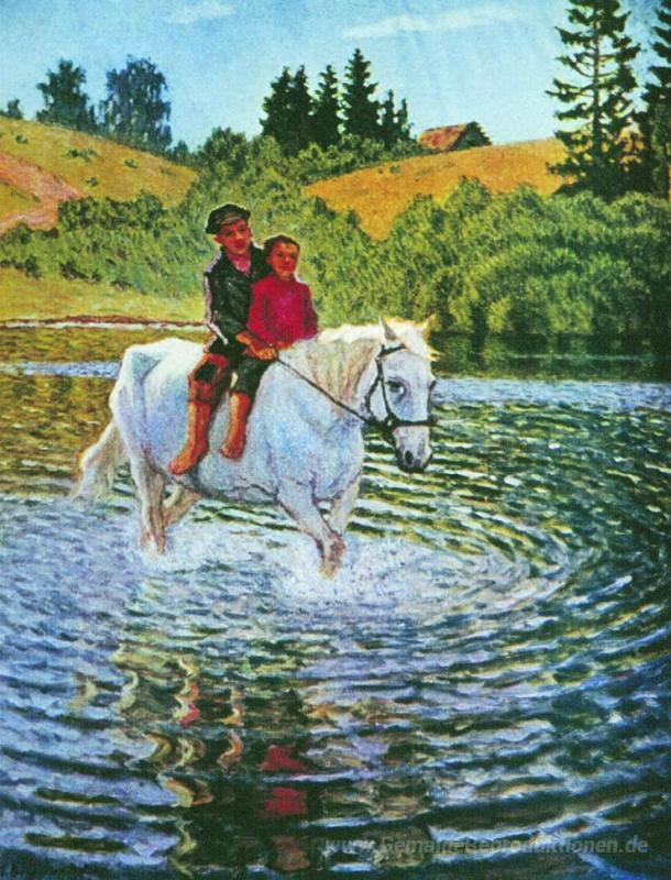 Wir bieten Ihnen eine handgefertigte Reproduktion auf Leinwand des berühmten Kunstwerks 'Kinder auf einem Pferd' von Nikolay Bogdanov-Belsky, aus dem Reproduktionsmuseum.