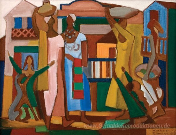 Wir bieten Ihnen eine handgefertigte Reproduktion auf Leinwand des berühmten Kunstwerks 'Komposition mit Figuren' von Mario Zanini, aus dem Reproduktionsmuseum.