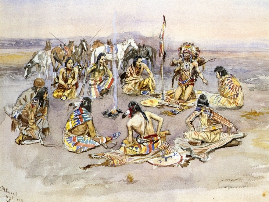 Wir bieten Ihnen eine handgefertigte Reproduktion auf Leinwand des berühmten Kunstwerks 'Kriegsrat' von Charles M. Russell, aus dem Reproduktionsmuseum.