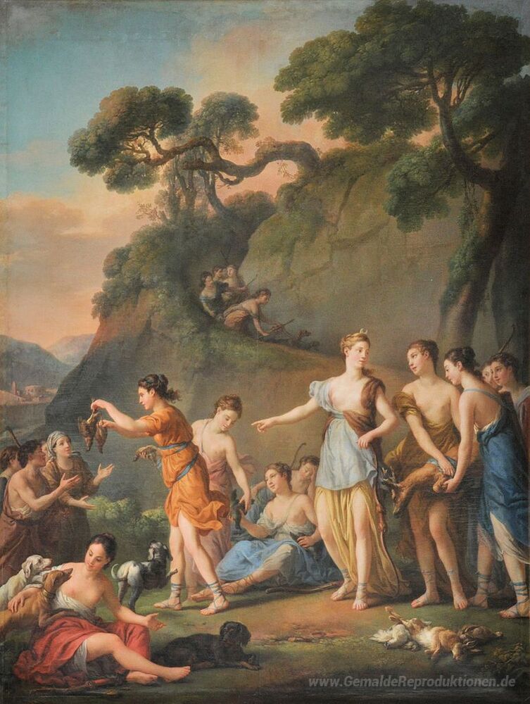 Wir bieten Ihnen eine handgefertigte Reproduktion auf Leinwand des berühmten Kunstwerks 'La Chasse' von Joseph-Marie Vien, aus dem Reproduktionsmuseum.
