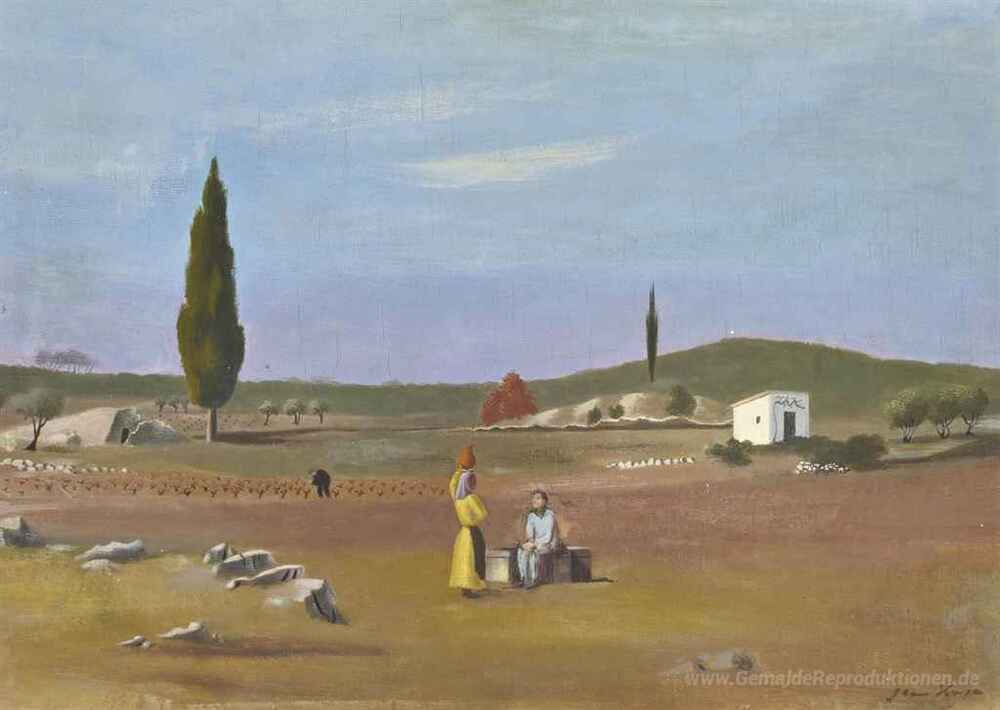 Wir bieten Ihnen eine handgefertigte Reproduktion auf Leinwand des berühmten Kunstwerks 'La Gespräch au Puits' von Jean Hugo, aus dem Reproduktionsmuseum.