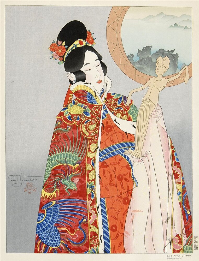 Wir bieten Ihnen eine handgefertigte Reproduktion auf Leinwand des berühmten Kunstwerks 'La Statuette Thang. Mandchoukuo' von Paul Jacoulet, aus dem Reproduktionsmuseum.