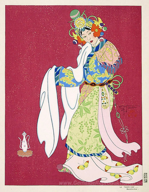 Wir bieten Ihnen eine handgefertigte Reproduktion auf Leinwand des berühmten Kunstwerks 'La Tragedienne. Mandchoukuo' von Paul Jacoulet, aus dem Reproduktionsmuseum.