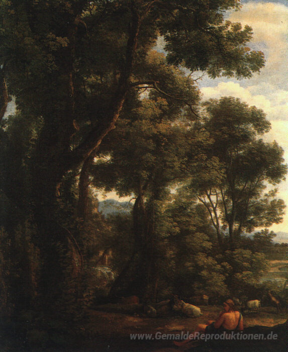 Wir bieten Ihnen eine handgefertigte Reproduktion auf Leinwand des berühmten Kunstwerks 'Landschaft mit Ziegenhirt' von Claude Lorrain, aus dem Reproduktionsmuseum.