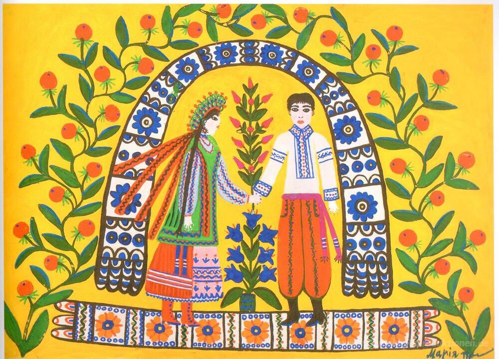 Wir bieten Ihnen eine handgefertigte Reproduktion auf Leinwand des berühmten Kunstwerks 'Lassen Sie uns auf die Verlobung Party gehen' von Maria Primachenko, aus dem Reproduktionsmuseum.