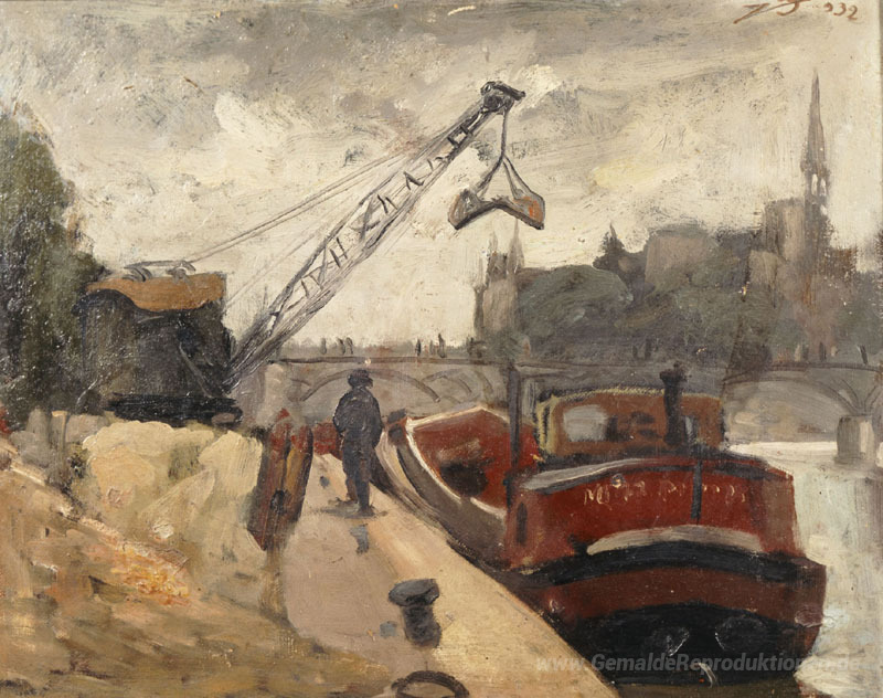 Wir bieten Ihnen eine handgefertigte Reproduktion auf Leinwand des berühmten Kunstwerks 'Lasten mit einem Kran Lastkahn auf der Seine' von Alekos Kontopoulos , aus dem Reproduktionsmuseum.