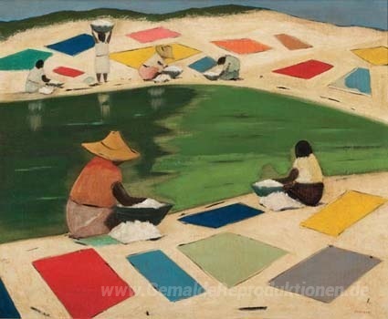 Wir bieten Ihnen eine handgefertigte Reproduktion auf Leinwand des berühmten Kunstwerks 'Lavadeiras do Abaeté' von Jose Pancetti, aus dem Reproduktionsmuseum.