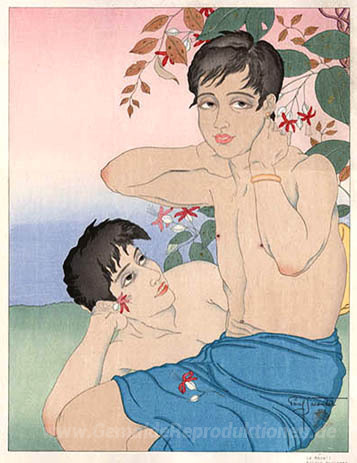 Wir bieten Ihnen eine handgefertigte Reproduktion auf Leinwand des berühmten Kunstwerks 'Le Reveil. Saipan, Marianen' von Paul Jacoulet, aus dem Reproduktionsmuseum.