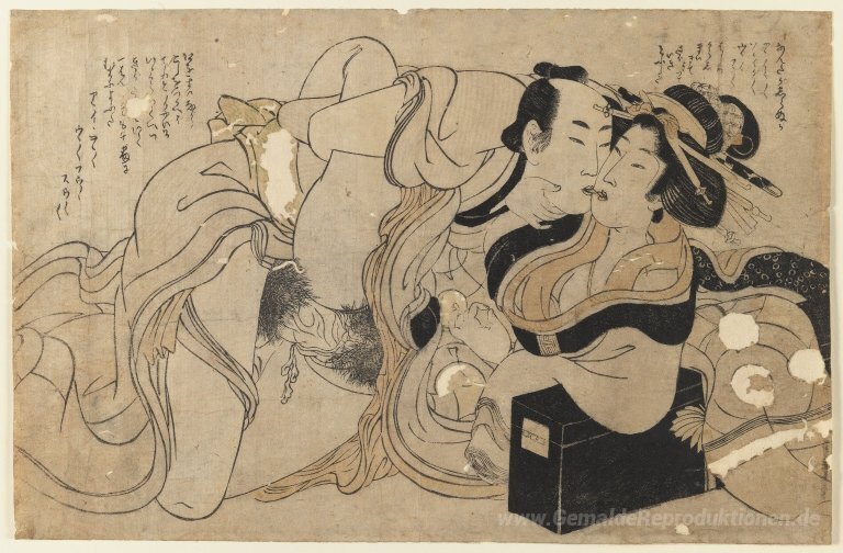 Wir bieten Ihnen eine handgefertigte Reproduktion auf Leinwand des berühmten Kunstwerks 'Liebespaar' von Kitagawa Utamaro, aus dem Reproduktionsmuseum.