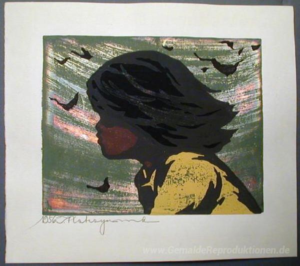 Wir bieten Ihnen eine handgefertigte Reproduktion auf Leinwand des berühmten Kunstwerks 'Mädchen im Wind' von Tadashi Nakayama, aus dem Reproduktionsmuseum.