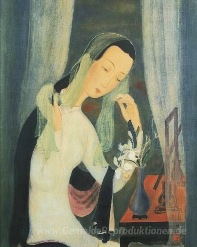 Wir bieten Ihnen eine handgefertigte Reproduktion auf Leinwand des berühmten Kunstwerks 'Mädchen mit grünen Schal' von Le Pho, aus dem Reproduktionsmuseum.