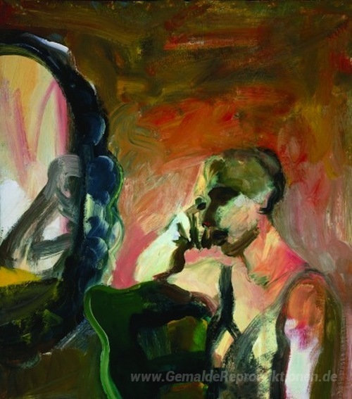 Wir bieten Ihnen eine handgefertigte Reproduktion auf Leinwand des berühmten Kunstwerks 'Mädchen mit Spiegel' von Elmer Bischoff, aus dem Reproduktionsmuseum.