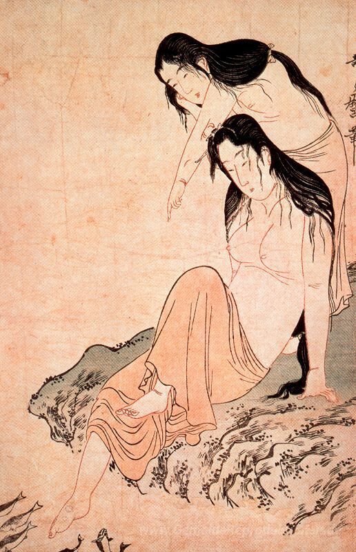Wir bieten Ihnen eine handgefertigte Reproduktion auf Leinwand des berühmten Kunstwerks 'Mädchen Perlentaucher' von Kitagawa Utamaro, aus dem Reproduktionsmuseum.