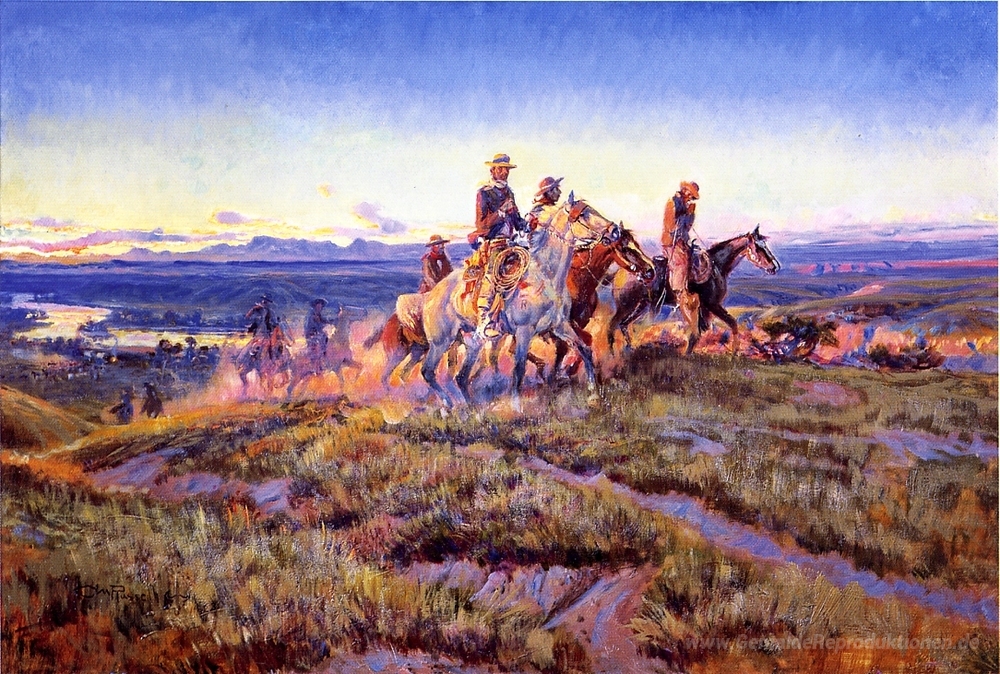 Wir bieten Ihnen eine handgefertigte Reproduktion auf Leinwand des berühmten Kunstwerks 'Männer des Open Range' von Charles M. Russell, aus dem Reproduktionsmuseum.
