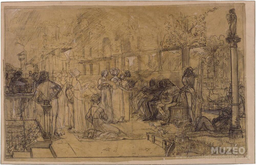 Wir bieten Ihnen eine handgefertigte Reproduktion auf Leinwand des berühmten Kunstwerks 'Männer und Frauen singen und Musik zu spielen' von Luc-Olivier Merson, aus dem Reproduktionsmuseum.