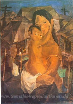 Wir bieten Ihnen eine handgefertigte Reproduktion auf Leinwand des berühmten Kunstwerks 'Madonna der Slums' von Vicente Manansala, aus dem Reproduktionsmuseum.