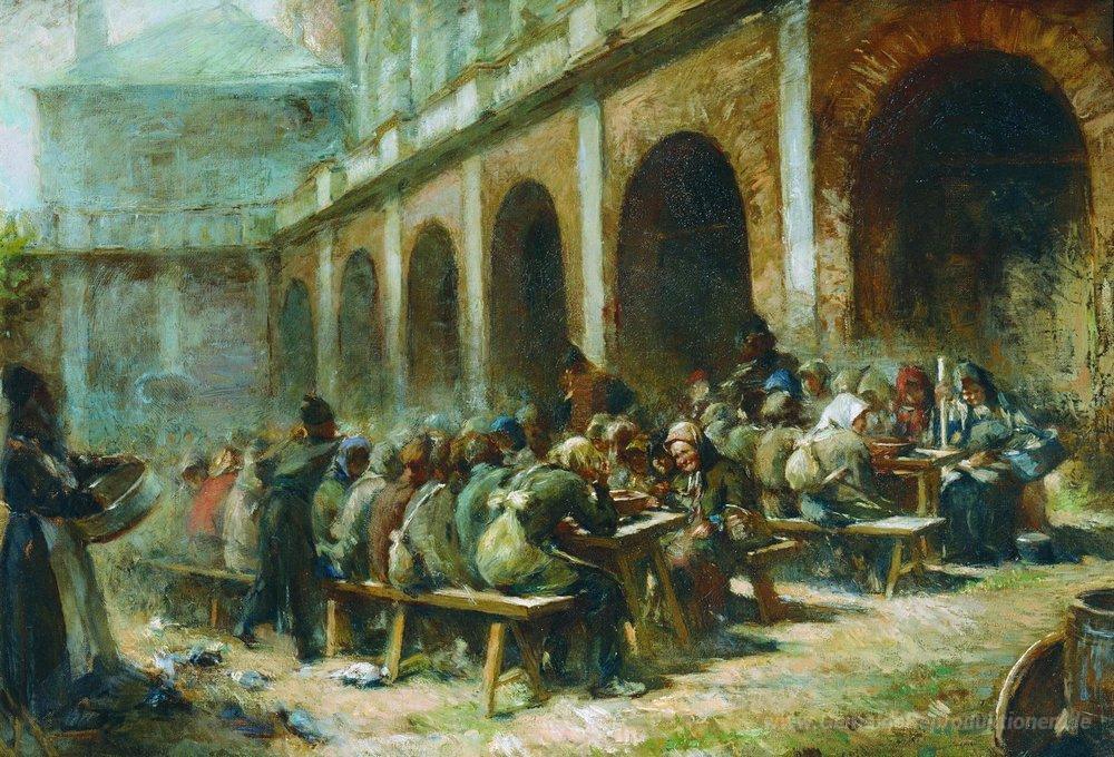 Wir bieten Ihnen eine handgefertigte Reproduktion auf Leinwand des berühmten Kunstwerks 'Mahlzeit von Pilgern in der Dreifaltigkeitskloster von Sergijew ' von Konstantin Makovsky, aus dem Reproduktionsmuseum.