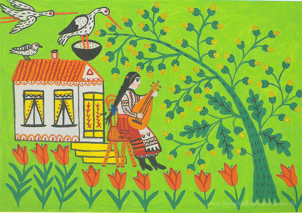 Wir bieten Ihnen eine handgefertigte Reproduktion auf Leinwand des berühmten Kunstwerks 'Maiden Spielt die Laute und wartet auf ihren Geliebten' von Maria Primachenko, aus dem Reproduktionsmuseum.