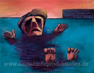 Wir bieten Ihnen eine handgefertigte Reproduktion auf Leinwand des berühmten Kunstwerks 'Man Schwimmdock' von Charles Blackman, aus dem Reproduktionsmuseum.