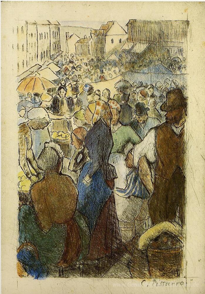 Wir bieten Ihnen eine handgefertigte Reproduktion auf Leinwand des berühmten Kunstwerks 'Markt am Gisors, Rue Cappeville' von Camille Pissarro, aus dem Reproduktionsmuseum.