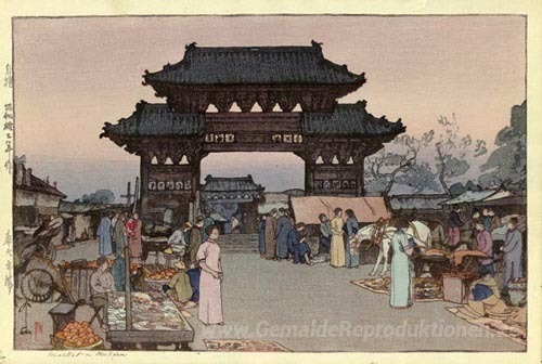 Wir bieten Ihnen eine handgefertigte Reproduktion auf Leinwand des berühmten Kunstwerks 'Markt in Mukden' von Hiroshi Yoshida, aus dem Reproduktionsmuseum.