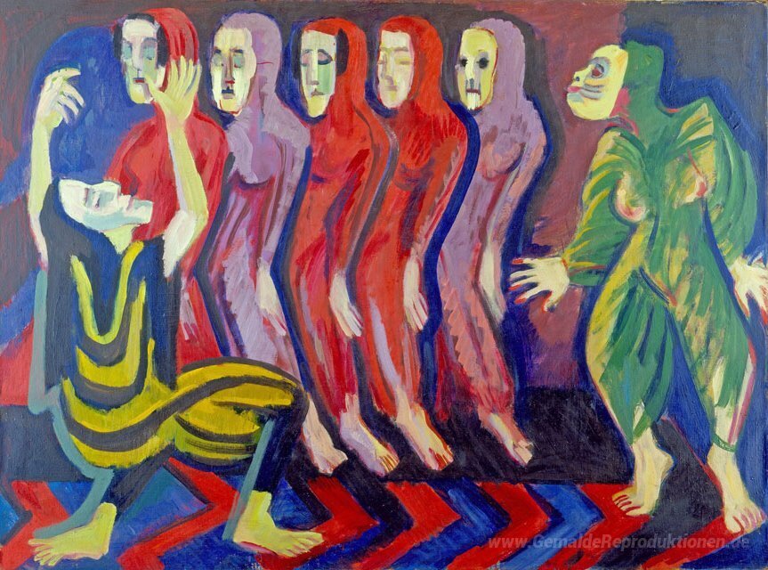 Wir bieten Ihnen eine handgefertigte Reproduktion auf Leinwand des berühmten Kunstwerks 'Mary Wigman Dance of the Dead' von Ernst Ludwig Kirchner, aus dem Reproduktionsmuseum.