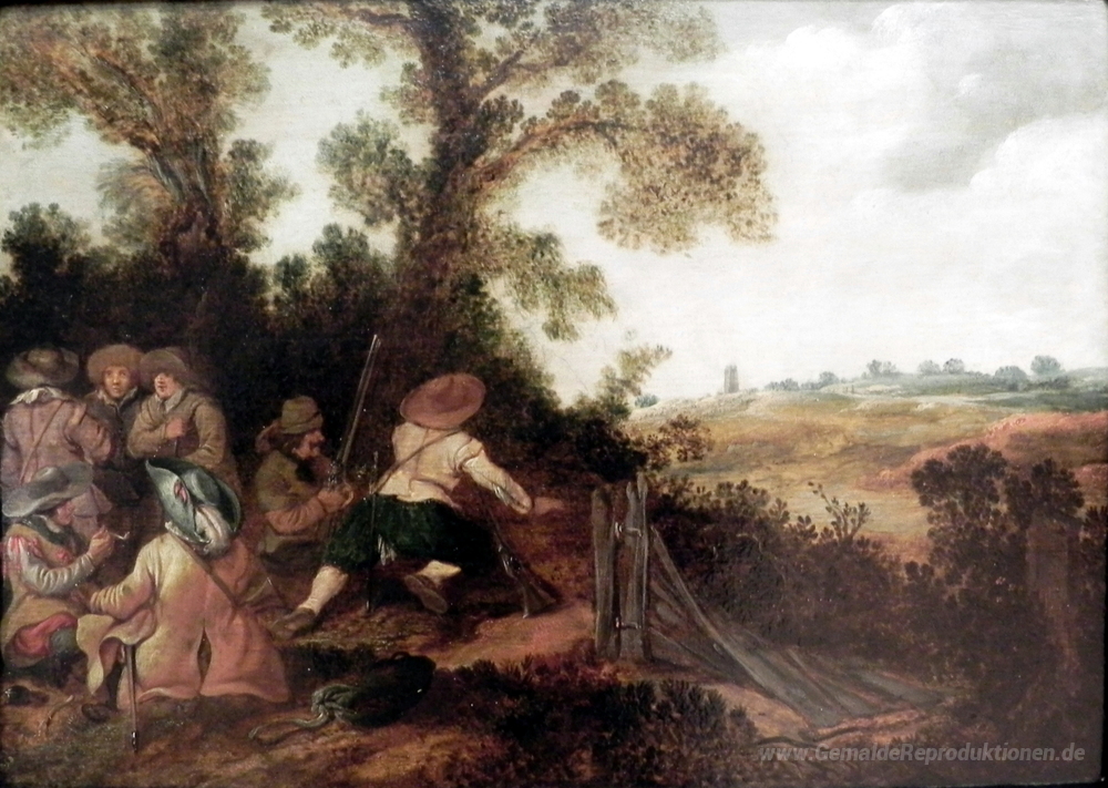 Wir bieten Ihnen eine handgefertigte Reproduktion auf Leinwand des berühmten Kunstwerks 'Miliz in den Dünen im Hinterhalt' von Esaias van de Velde, aus dem Reproduktionsmuseum.