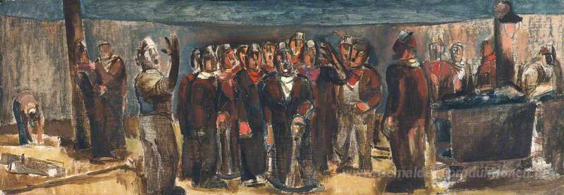 Wir bieten Ihnen eine handgefertigte Reproduktion auf Leinwand des berühmten Kunstwerks 'Miners Singen' von Josef Herman, aus dem Reproduktionsmuseum.