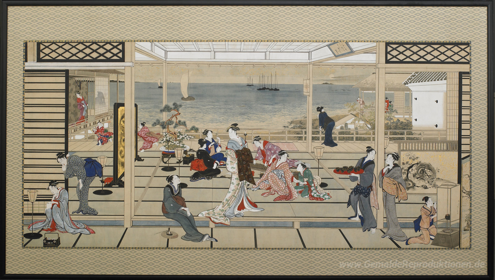 Wir bieten Ihnen eine handgefertigte Reproduktion auf Leinwand des berühmten Kunstwerks 'Moonlight Revelry bei Dozo Sagami' von Kitagawa Utamaro, aus dem Reproduktionsmuseum.