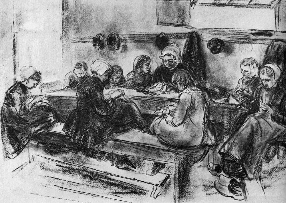 Wir bieten Ihnen eine handgefertigte Reproduktion auf Leinwand des berühmten Kunstwerks 'Nähschule' von Max Liebermann, aus dem Reproduktionsmuseum.