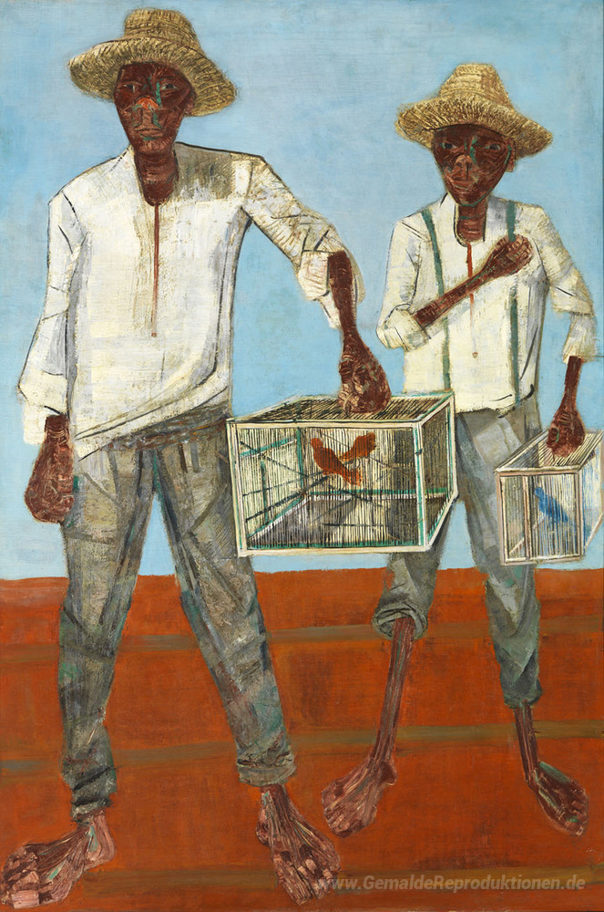 Wir bieten Ihnen eine handgefertigte Reproduktion auf Leinwand des berühmten Kunstwerks 'O Vendedor de Passarinhos' von Candido Portinari, aus dem Reproduktionsmuseum.