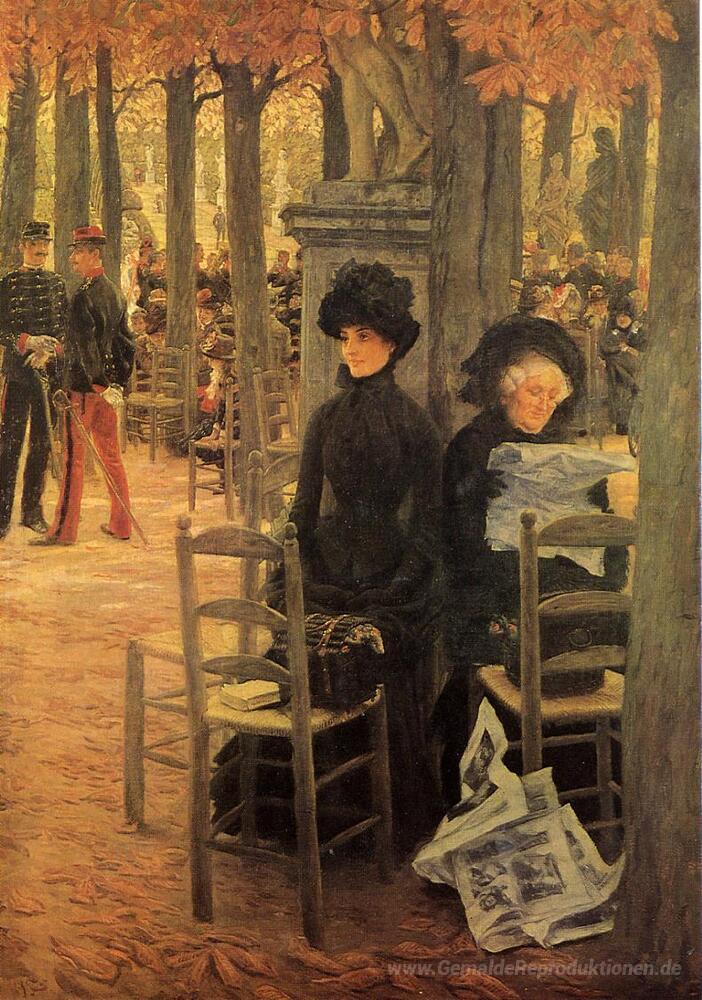 Wir bieten Ihnen eine handgefertigte Reproduktion auf Leinwand des berühmten Kunstwerks 'Ohne Mitgift, aka Sonntag in der Luxemburg-Gärten' von James Tissot, aus dem Reproduktionsmuseum.