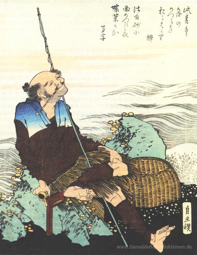 Wir bieten Ihnen eine handgefertigte Reproduktion auf Leinwand des berühmten Kunstwerks 'Old Fisherman rauchte seine Pfeife' von Katsushika Hokusai, aus dem Reproduktionsmuseum.