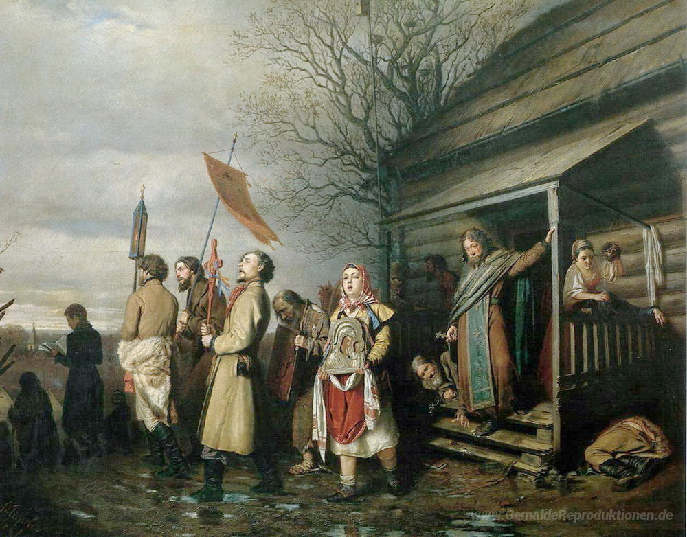 Wir bieten Ihnen eine handgefertigte Reproduktion auf Leinwand des berühmten Kunstwerks 'Osterprozession in einem Dorf' von Vasily Perov, aus dem Reproduktionsmuseum.