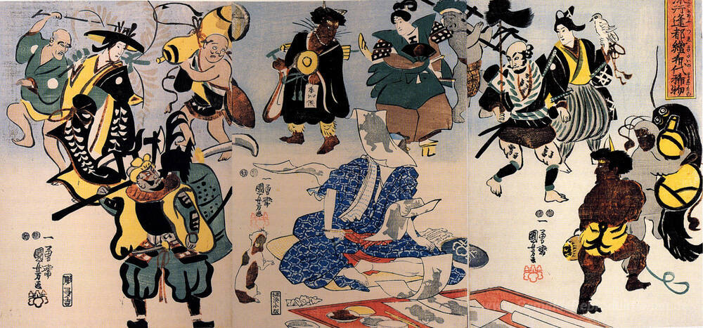 Wir bieten Ihnen eine handgefertigte Reproduktion auf Leinwand des berühmten Kunstwerks 'Otsu-e Gemälde zum Leben erwachen Triptychon' von Utagawa Kuniyoshi, aus dem Reproduktionsmuseum.