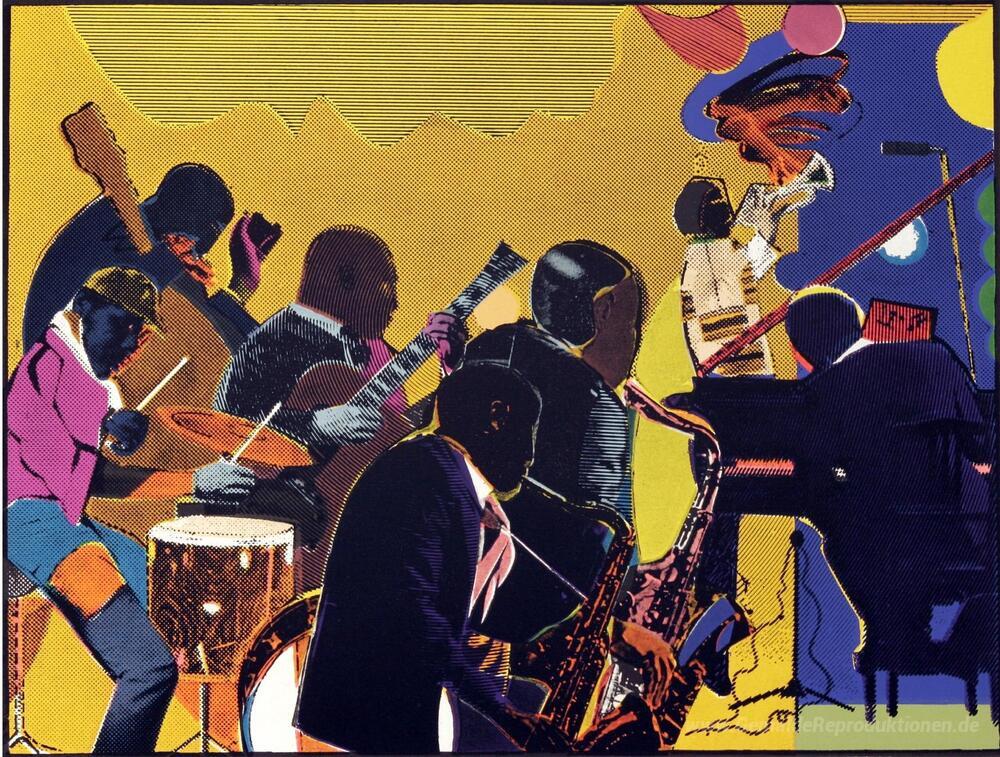 Wir bieten Ihnen eine handgefertigte Reproduktion auf Leinwand des berühmten Kunstwerks 'Out Chorus' von Romare Bearden, aus dem Reproduktionsmuseum.