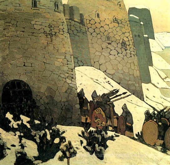 Wir bieten Ihnen eine handgefertigte Reproduktion auf Leinwand des berühmten Kunstwerks 'Patrouillieren' von Nicholas Roerich, aus dem Reproduktionsmuseum.