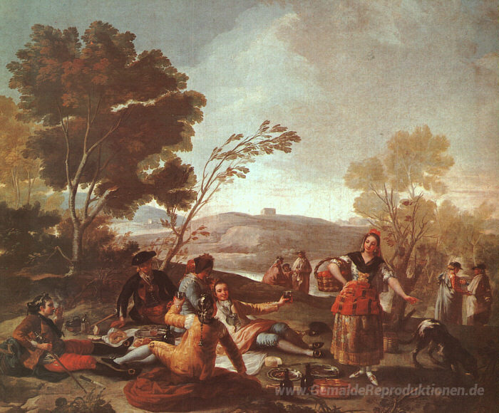 Wir bieten Ihnen eine handgefertigte Reproduktion auf Leinwand des berühmten Kunstwerks 'Picknick an den Ufern des Manzanares' von Francisco Goya, aus dem Reproduktionsmuseum.