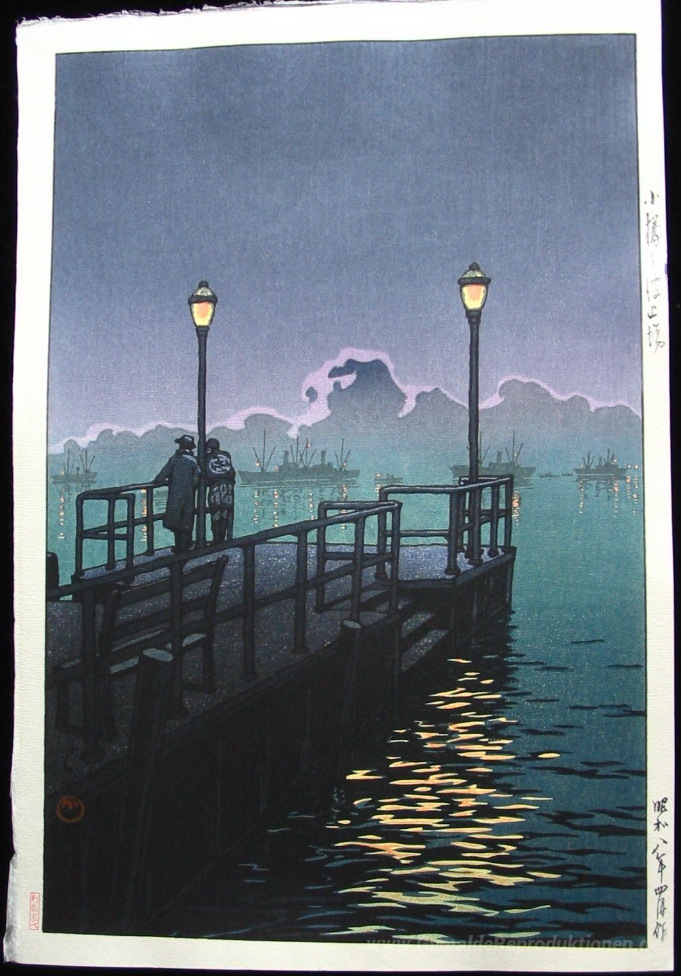 Wir bieten Ihnen eine handgefertigte Reproduktion auf Leinwand des berühmten Kunstwerks 'Pier in Otaru, Hafen bei Nacht' von Hasui Kawase, aus dem Reproduktionsmuseum.