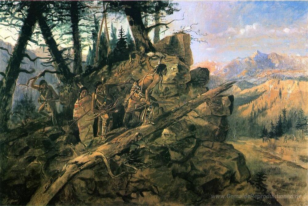 Wir bieten Ihnen eine handgefertigte Reproduktion auf Leinwand des berühmten Kunstwerks 'Plunder auf dem Horizont' von Charles M. Russell, aus dem Reproduktionsmuseum.