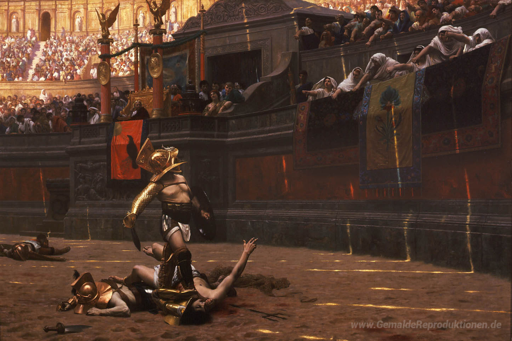 Wir bieten Ihnen eine handgefertigte Reproduktion auf Leinwand des berühmten Kunstwerks 'Pollice Rückseite' von Jean-Leon Gerome, aus dem Reproduktionsmuseum.