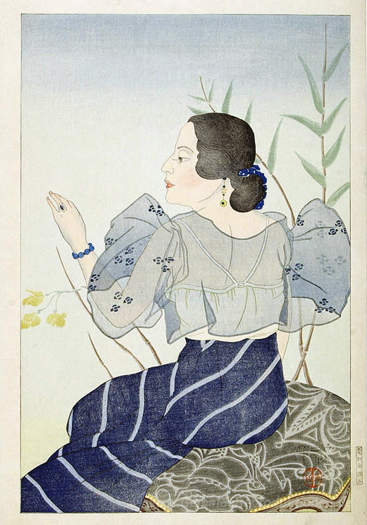 Wir bieten Ihnen eine handgefertigte Reproduktion auf Leinwand des berühmten Kunstwerks 'Portrait einer Frau Chamorro - Indigo' von Paul Jacoulet, aus dem Reproduktionsmuseum.