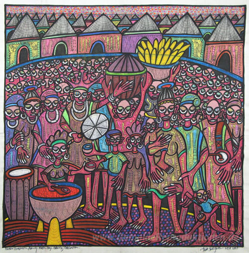 Willkommen in der faszinierenden Welt der Ölgemälde, wo jeder Pinselstrich eine Geschichte erzählt. Entdecken Sie das eindrucksvolle Werk Priester und Priesterin in Festivity Stimmung der Ibeji Ceremony von dem renommierten Künstler Twins Seven Seven. Dieser außergewöhnliche Künstler verbindet traditionelle afrikanische Kunst mit modernen Techniken, wodurch eine einzigartige visuelle Sprache entsteht, die den Betrachter in ihren Bann zieht.