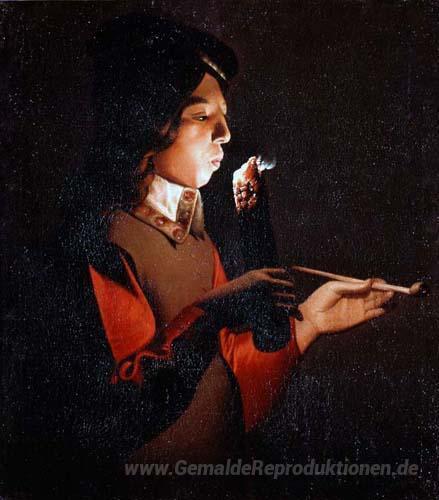 Wir bieten Ihnen eine handgefertigte Reproduktion auf Leinwand des berühmten Kunstwerks 'Raucher' von Georges de la Tour, aus dem Reproduktionsmuseum.
