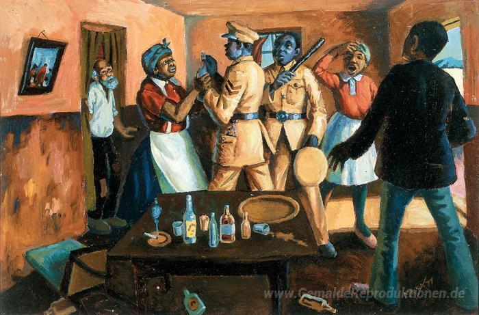 Wir bieten Ihnen eine handgefertigte Reproduktion auf Leinwand des berühmten Kunstwerks 'Razzia' von George Pemba, aus dem Reproduktionsmuseum.