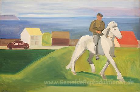Wir bieten Ihnen eine handgefertigte Reproduktion auf Leinwand des berühmten Kunstwerks 'Reiter in der isländischen Dorf' von Louisa Matthiasdottir, aus dem Reproduktionsmuseum.