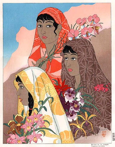 Wir bieten Ihnen eine handgefertigte Reproduktion auf Leinwand des berühmten Kunstwerks 'Retour De La Jungle. Tondano, Celebes' von Paul Jacoulet, aus dem Reproduktionsmuseum.